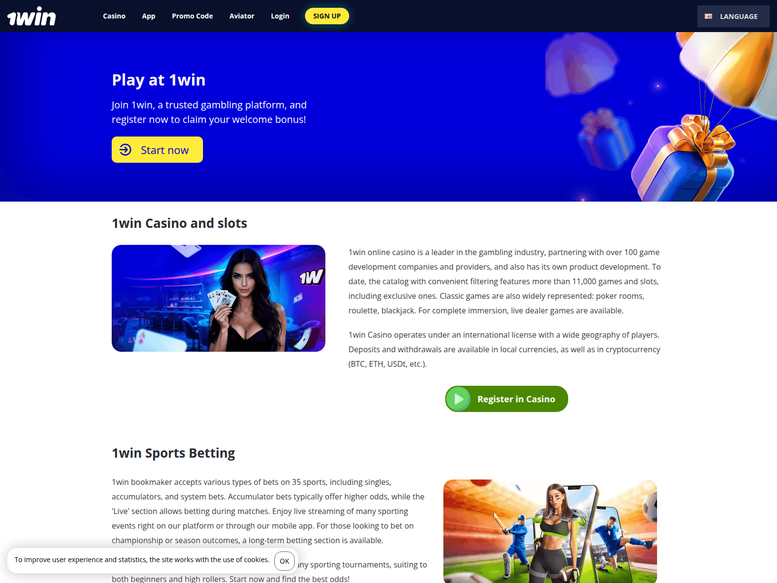 The site displays a page titled “Play at 1Win International - Bookmaker, Sport betting and Casino”.