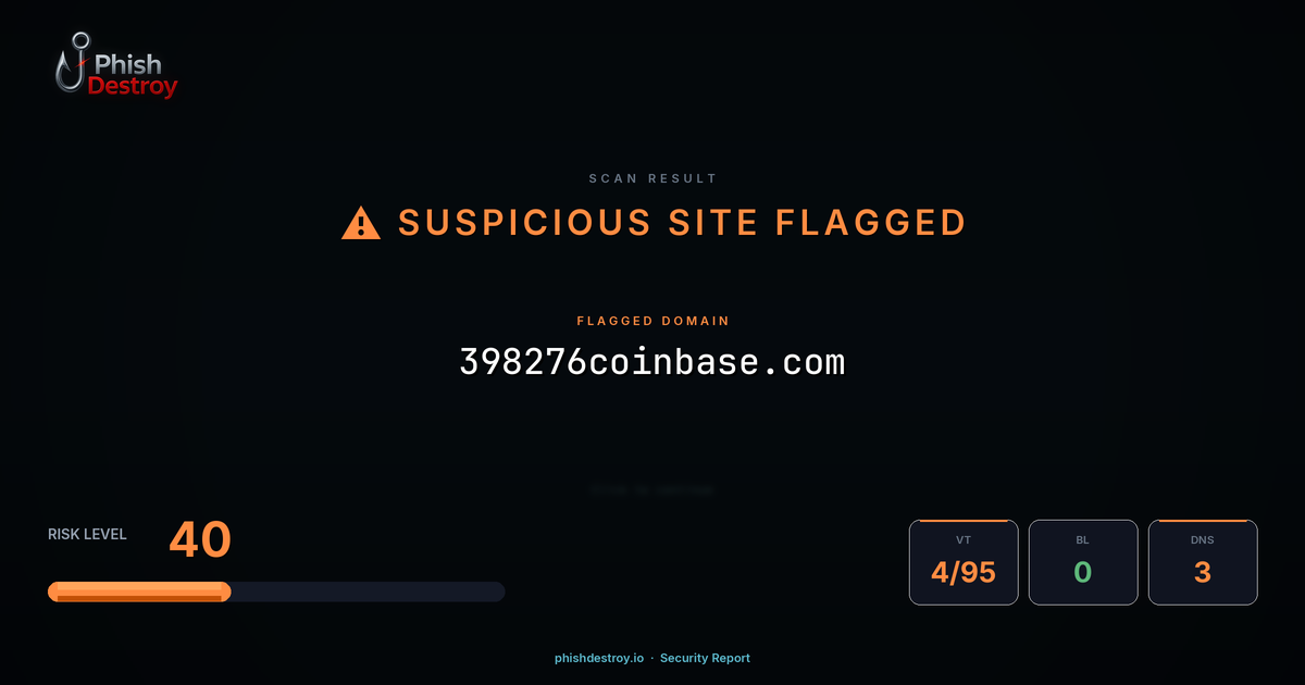 This domain security report for 398276coinbase.com is maintained by PhishDestroy's automated threat intelligence pipeline. Our system continuously monitors this domain across 4 security vendors on VirusTotal, 1 public blocklists.