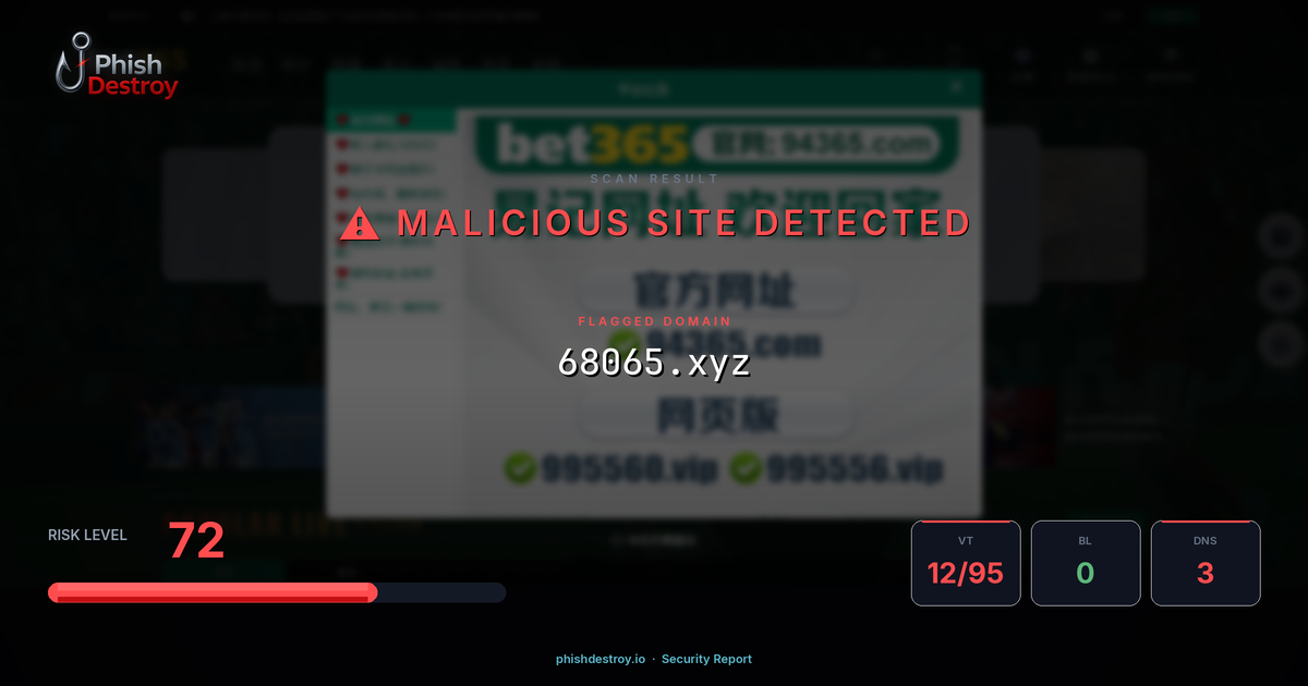 This domain security report for 68065.xyz is maintained by PhishDestroy's automated threat intelligence pipeline. Our system continuously monitors this domain across 12 security vendors on VirusTotal, 1 public blocklists.
