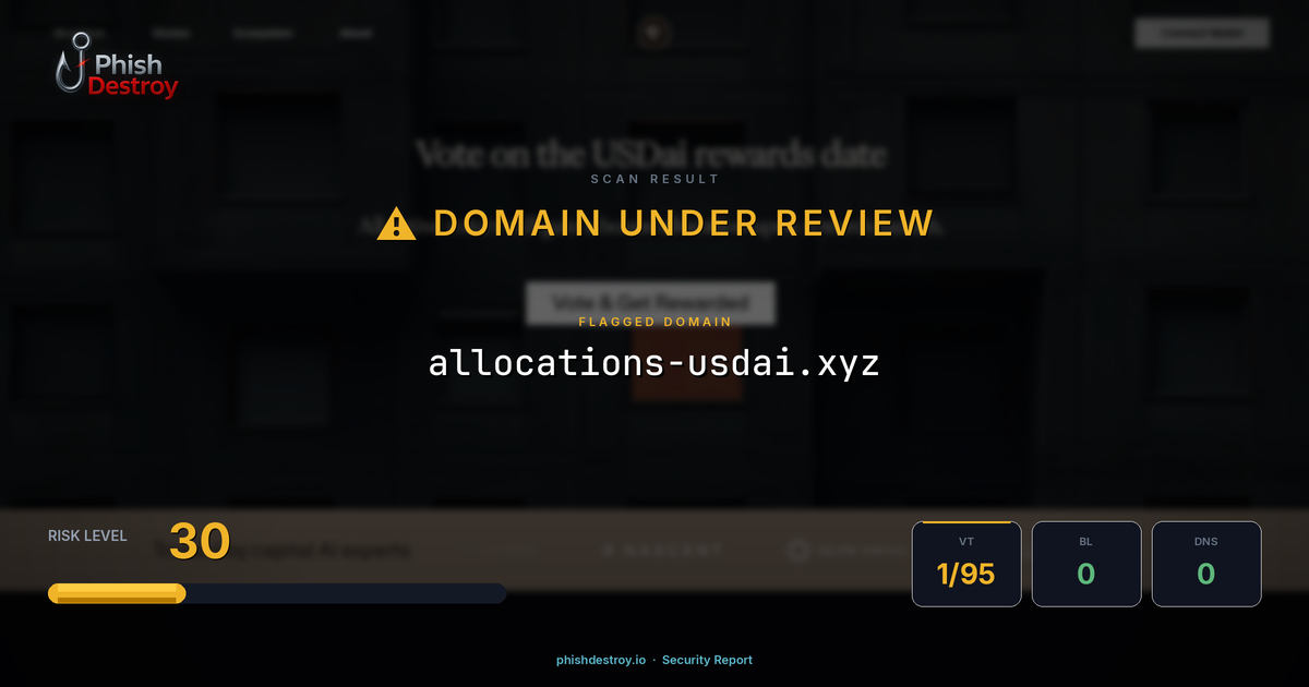 This domain security report for allocations-usdai.xyz is maintained by PhishDestroy's automated threat intelligence pipeline. Our system continuously monitors this domain across 1 security vendors on VirusTotal, 1 public blocklists.