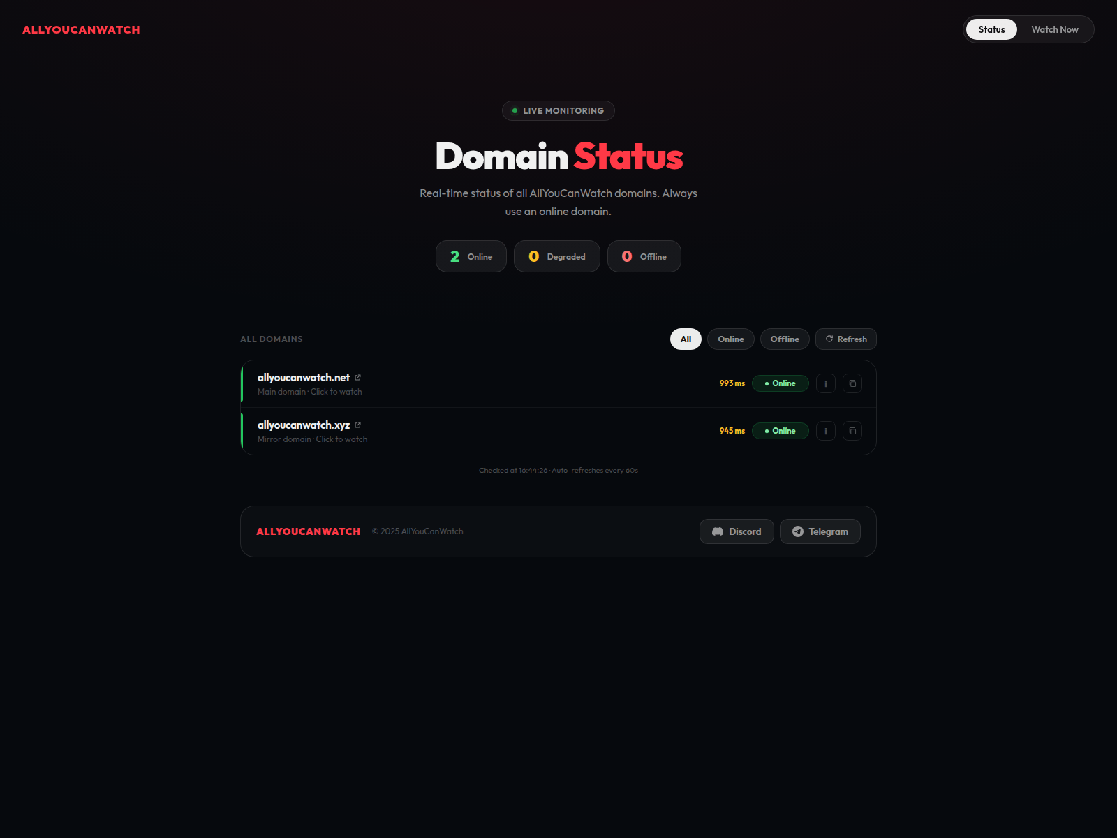 The site displays a page titled “Domain Status · AllYouCanWatch”.