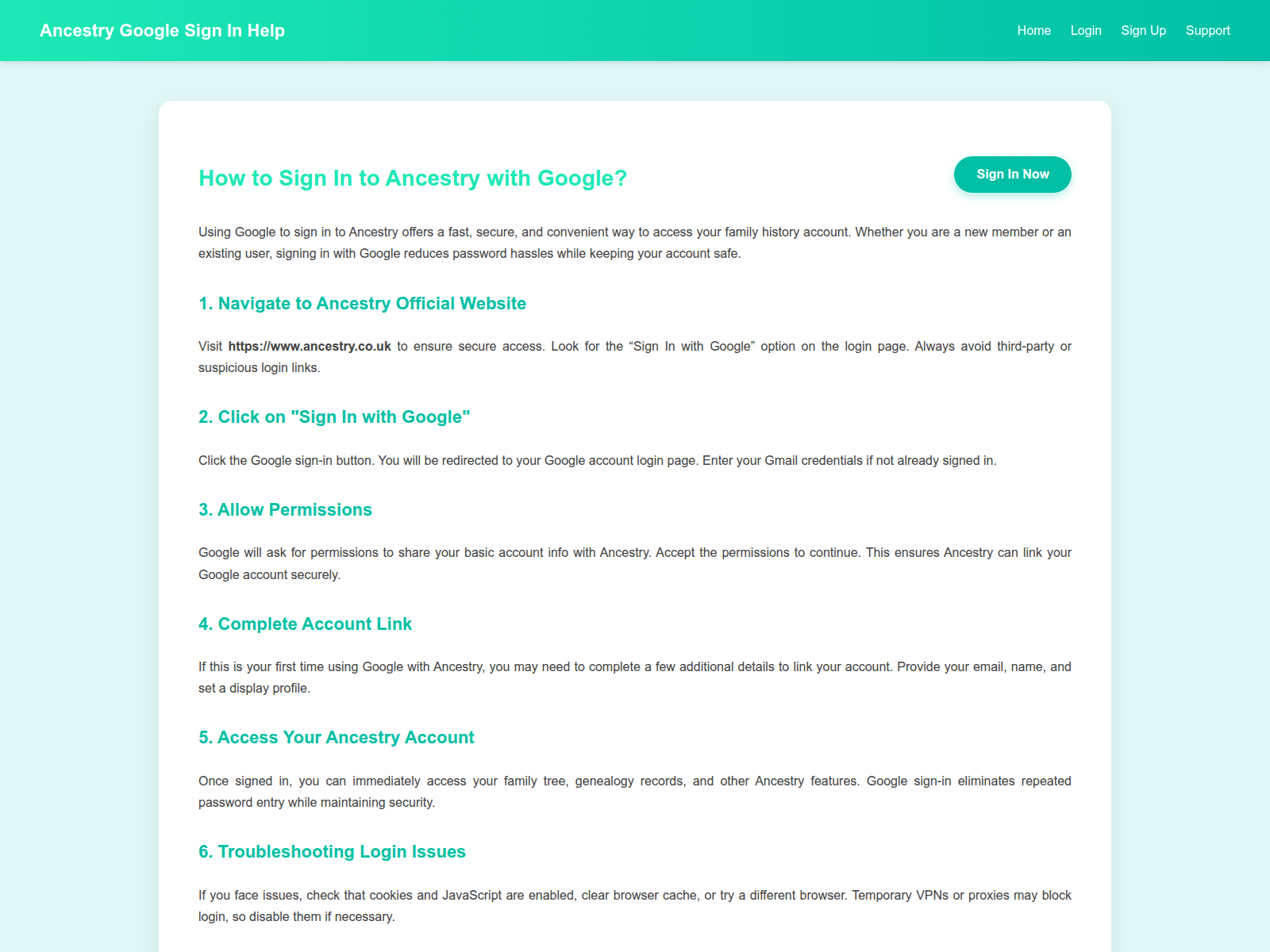 The site displays a page titled “How to Ancestry Sign In with Google? Easy Guide”, which may be designed to impersonate Google.