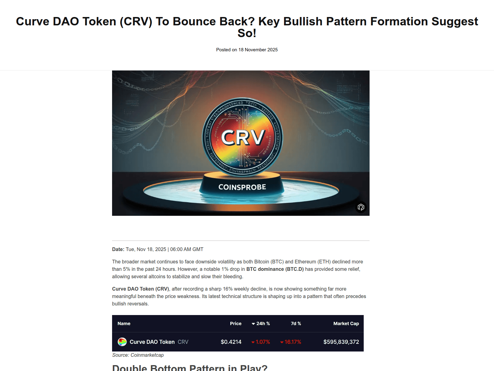 The site displays a page titled “Curve DAO Token (CRV) To Bounce Back? Key Bullish Pattern Formation Suggest So!”, which may be designed to impersonate Curve.