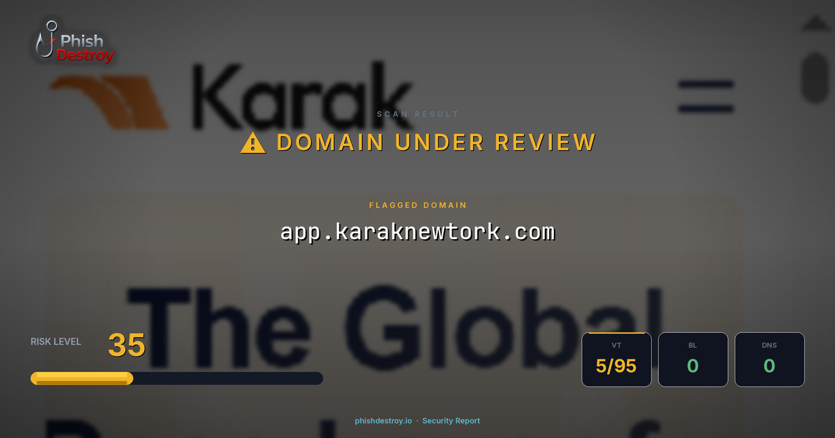 This domain security report for app.karaknewtork.com is maintained by PhishDestroy's automated threat intelligence pipeline. Our system continuously monitors this domain across 5 security vendors on VirusTotal, 1 public blocklists.
