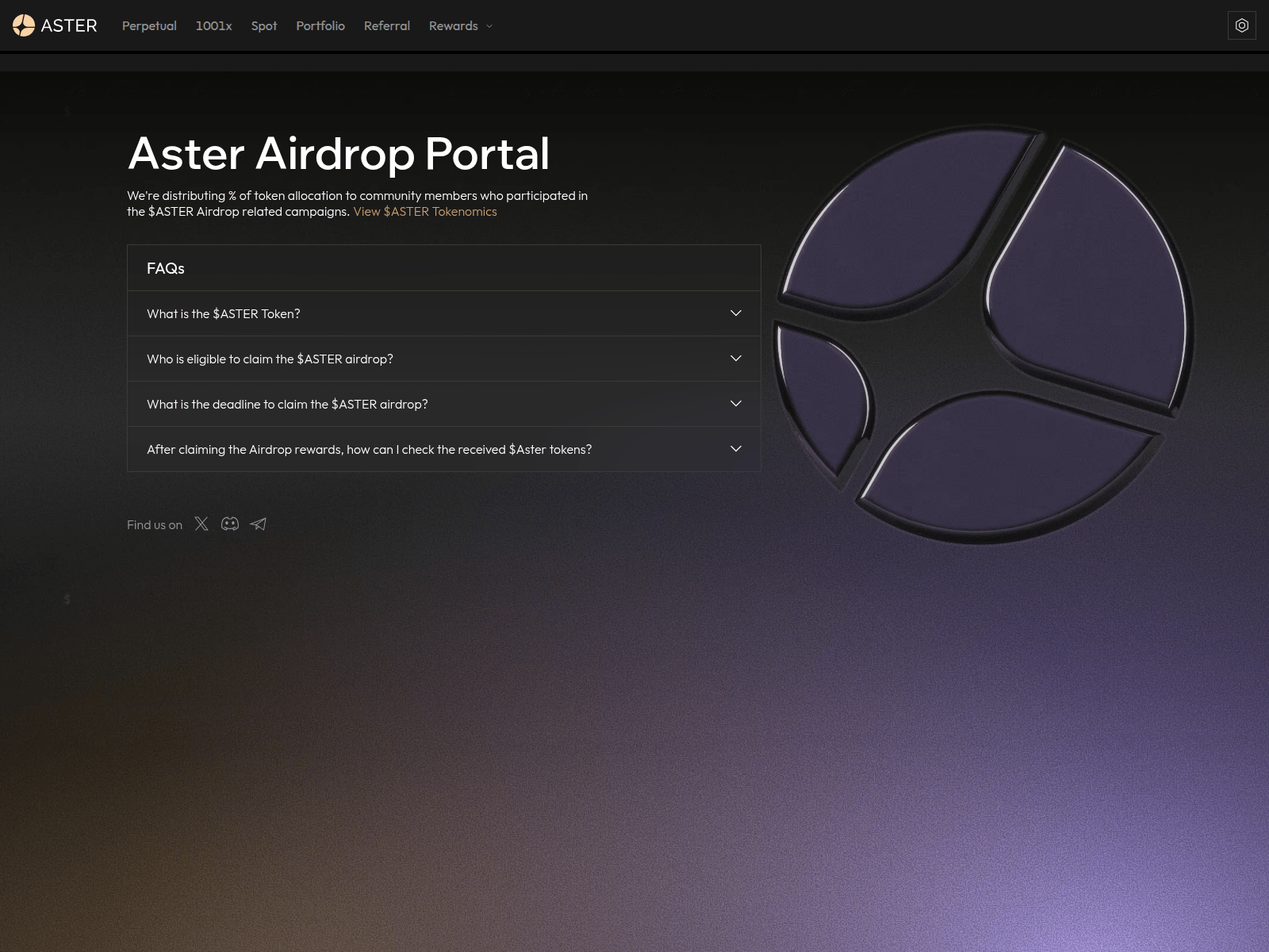 The site displays a page titled “Aster DEX - Leading Decentralized Exchange | Trade Perpetuals with Low Fees & High Leverage”.