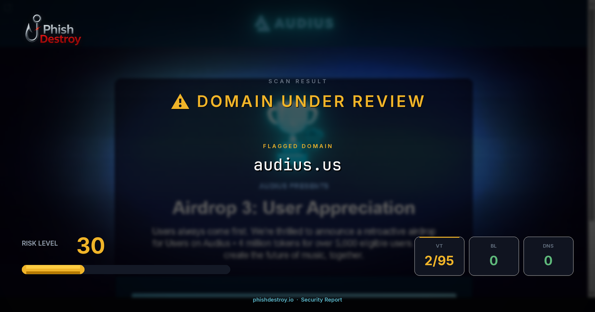 This domain security report for audius.us is maintained by PhishDestroy's automated threat intelligence pipeline. Our system continuously monitors this domain across 2 security vendors on VirusTotal, 1 public blocklists.