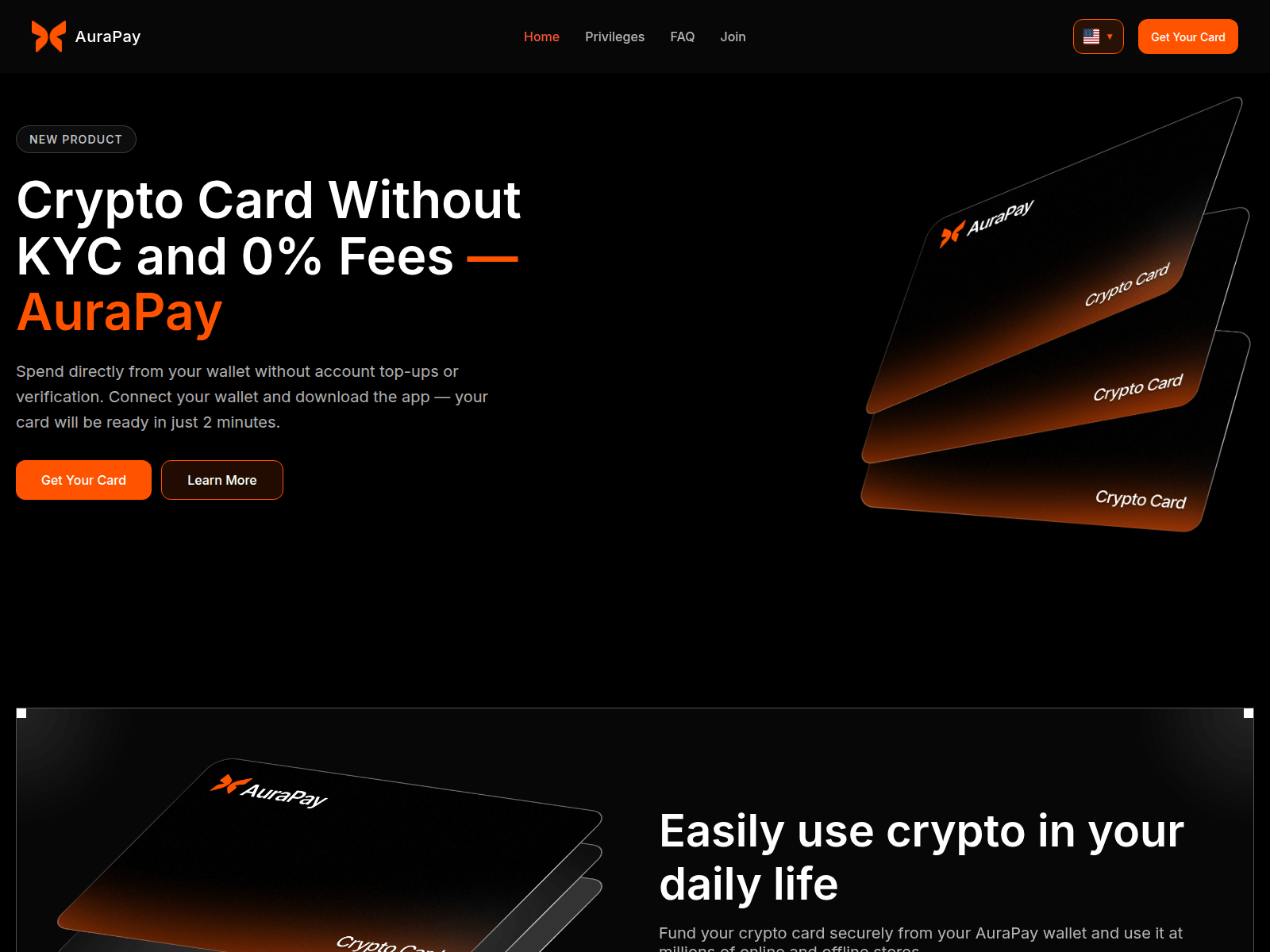 The site displays a page titled “Aura Pay l Crypto Card without KYC”.