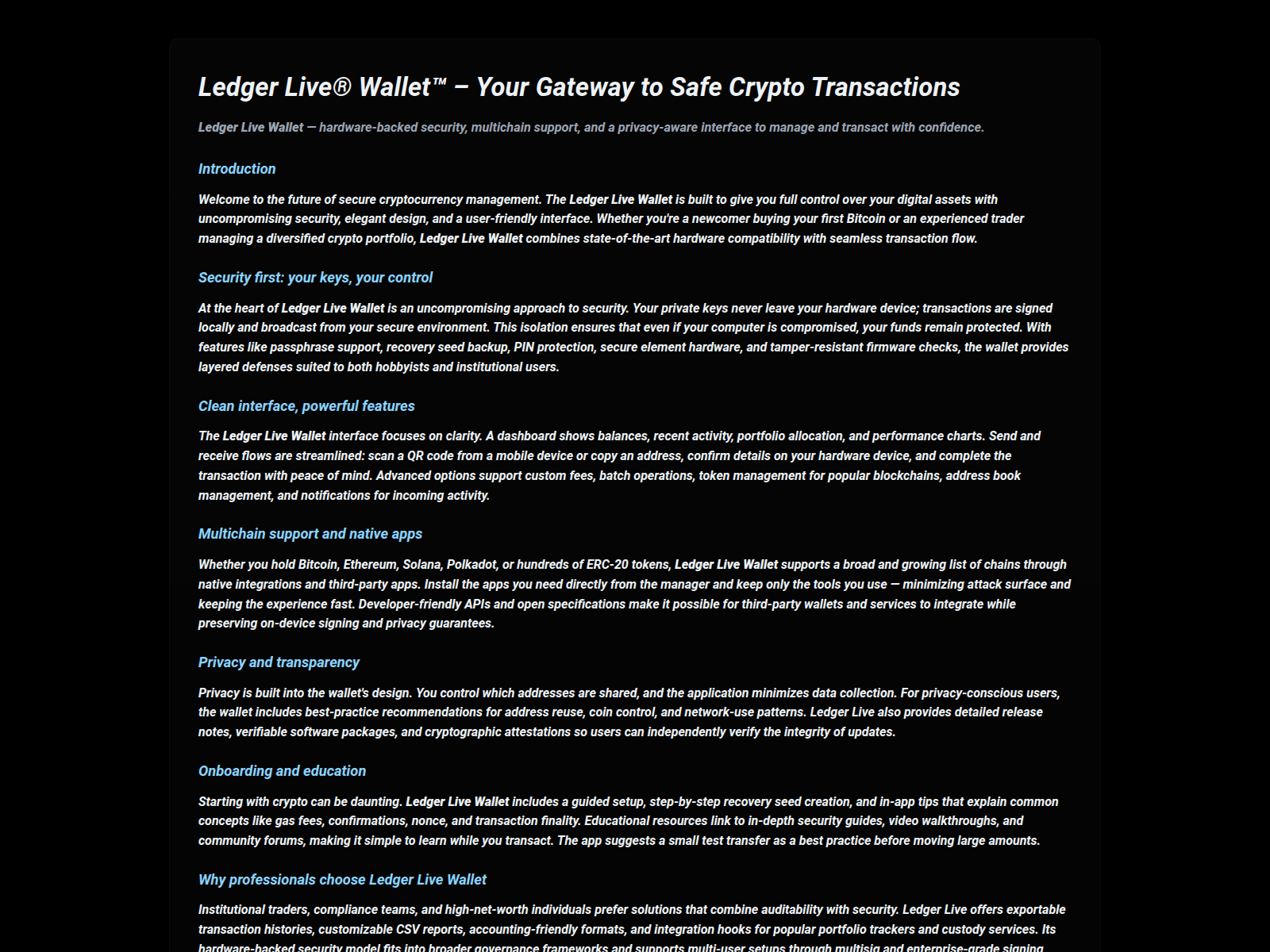- Use a hardware wallet (Ledger, Trezor). Never store large amounts in browser wallets