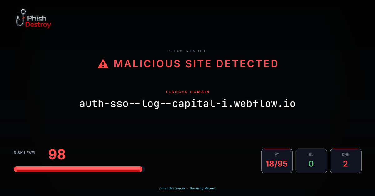 This domain security report for auth-sso--log--capital-i.webflow.io is maintained by PhishDestroy's automated threat intelligence pipeline. Our system continuously monitors this domain across 18 security vendors on VirusTotal, 1 public blocklists.