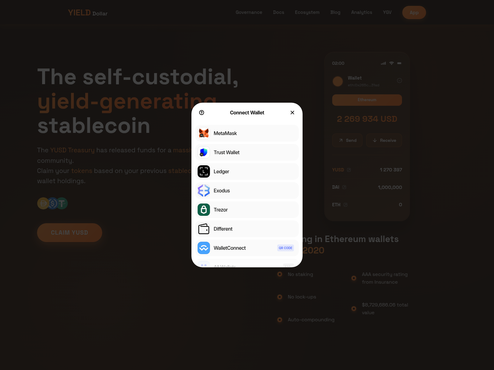 The site displays a page titled “Yield Dollar - Self-Custodial Yield-Generating Stablecoin”.