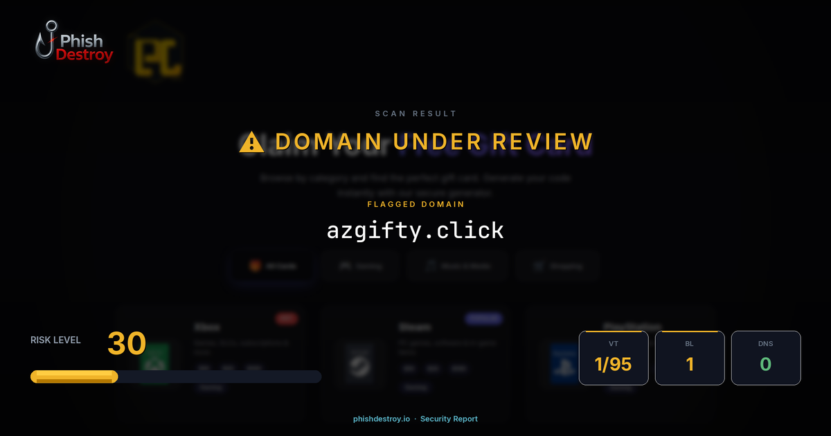 This domain security report for azgifty.click is maintained by PhishDestroy's automated threat intelligence pipeline. Our system continuously monitors this domain across 1 security vendors on VirusTotal, 1 public blocklists.