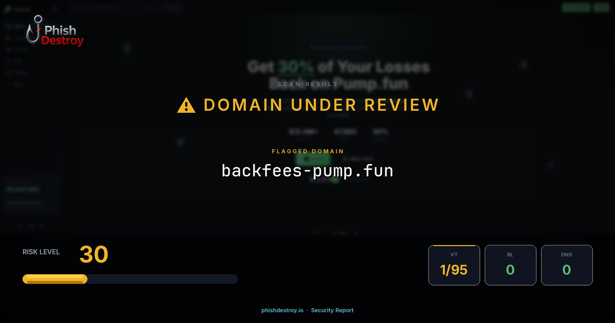 This domain security report for backfees-pump.fun is maintained by PhishDestroy's automated threat intelligence pipeline. Our system continuously monitors this domain across 1 security vendors on VirusTotal, 1 public blocklists.