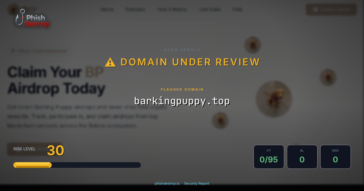 barkingpuppy.top has been listed on PhishDestroy as a suspicious domain. Scanned by 95 security vendors — automated detections may take time to update. PhishDestroy threat analysts continue to monitor this domain.