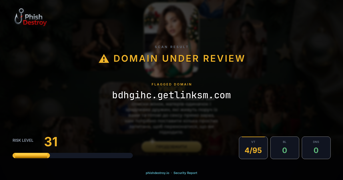The domain bdhgihc[.]getlinksm[.]com has been flagged as a phishing threat. PhishDestroy's automated scanning systems detected multiple risk indicators associated with this domain.