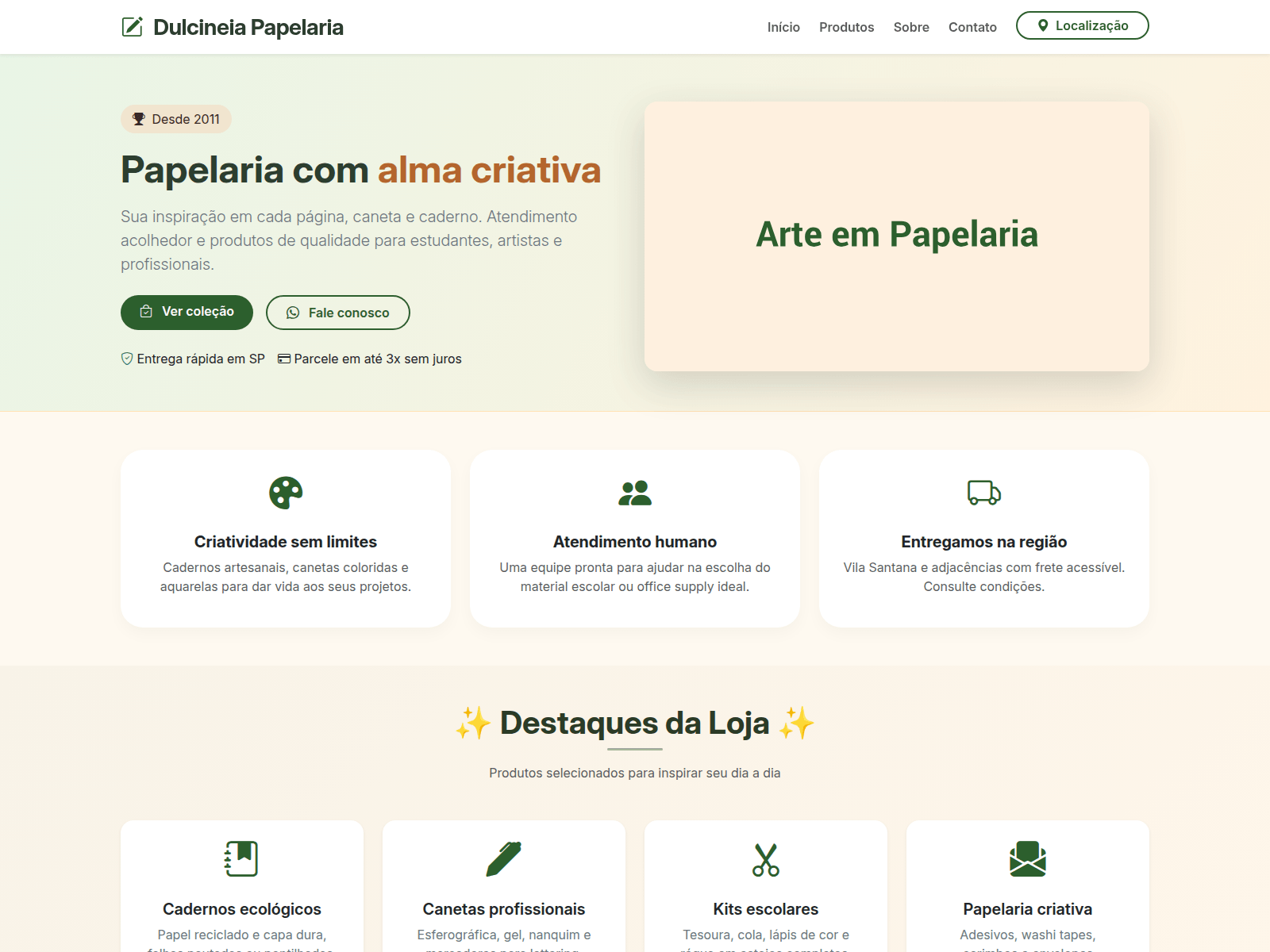 The site displays a page titled “Dulcineia Papelaria | Sua loja de artigos de papelaria”.