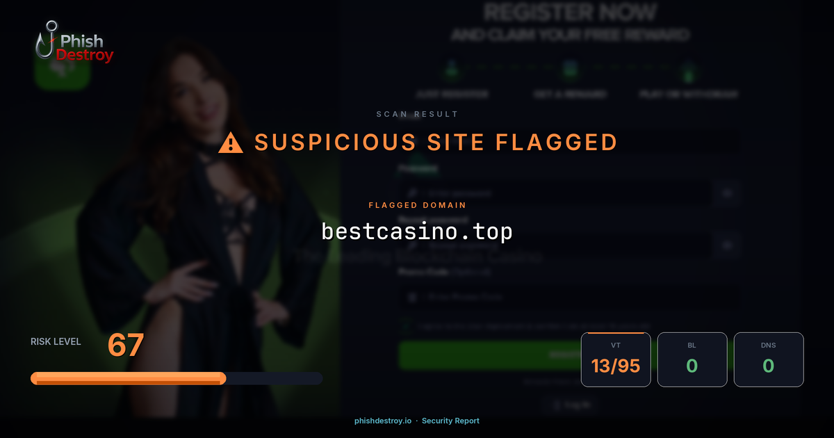 This domain security report for bestcasino.top is maintained by PhishDestroy's automated threat intelligence pipeline. Our system continuously monitors this domain across 13 security vendors on VirusTotal, 1 public blocklists.