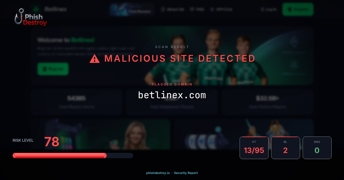 betlinex.com has been flagged by 13 security vendors as of March 17, 2026.