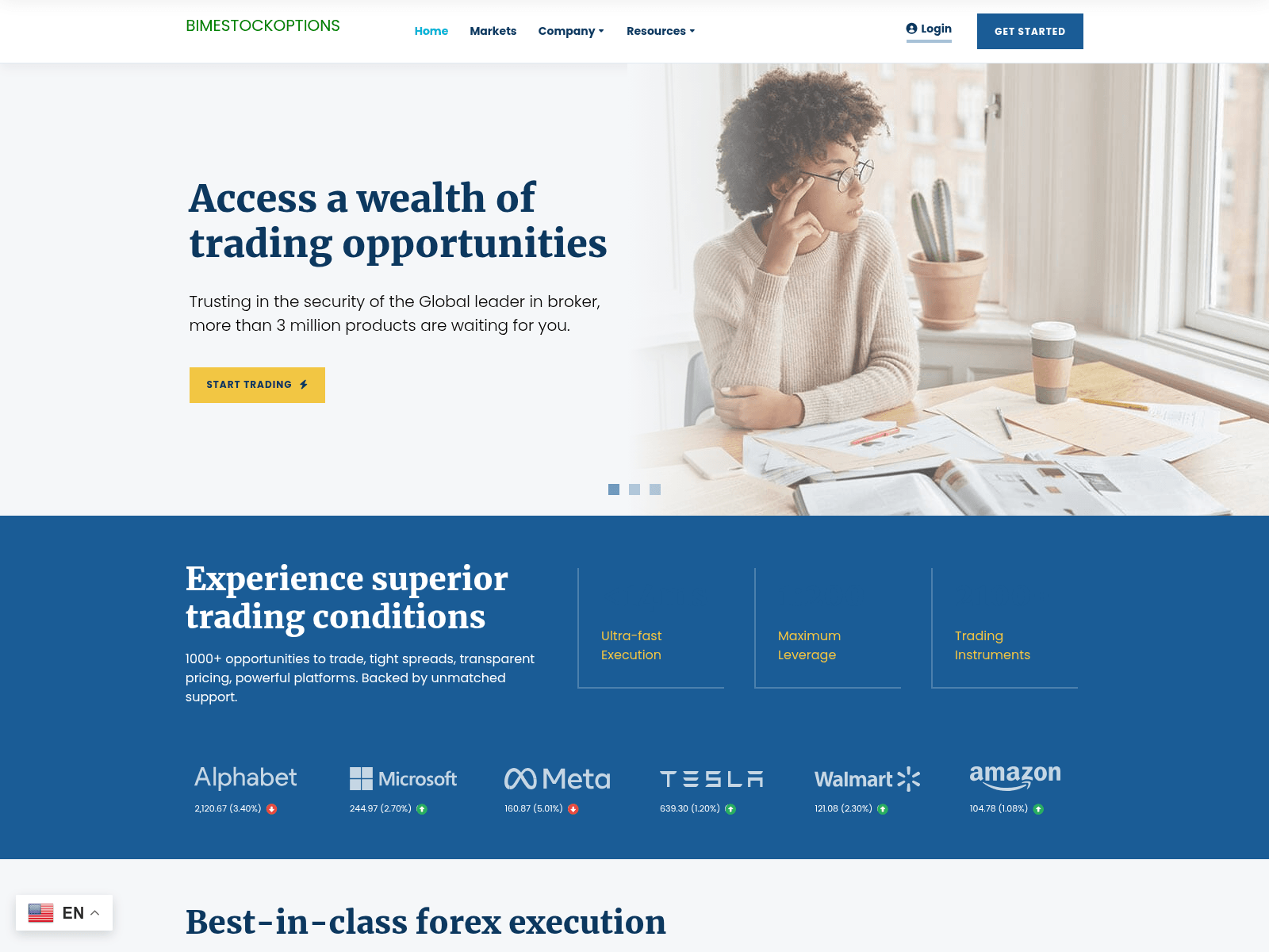 The site displays a page titled “bimeoptionstock | Access a Wealth of Trading Opportunities”.