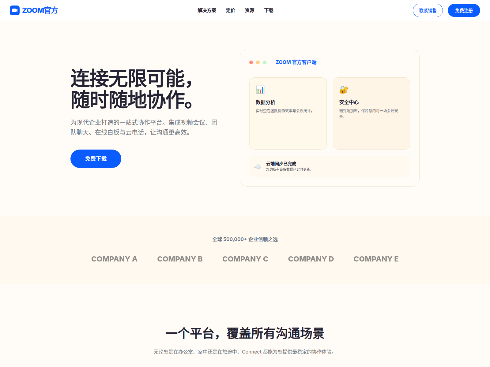 The site displays a page titled “Zoom 视频会议 高效办公沟通必备软件”.