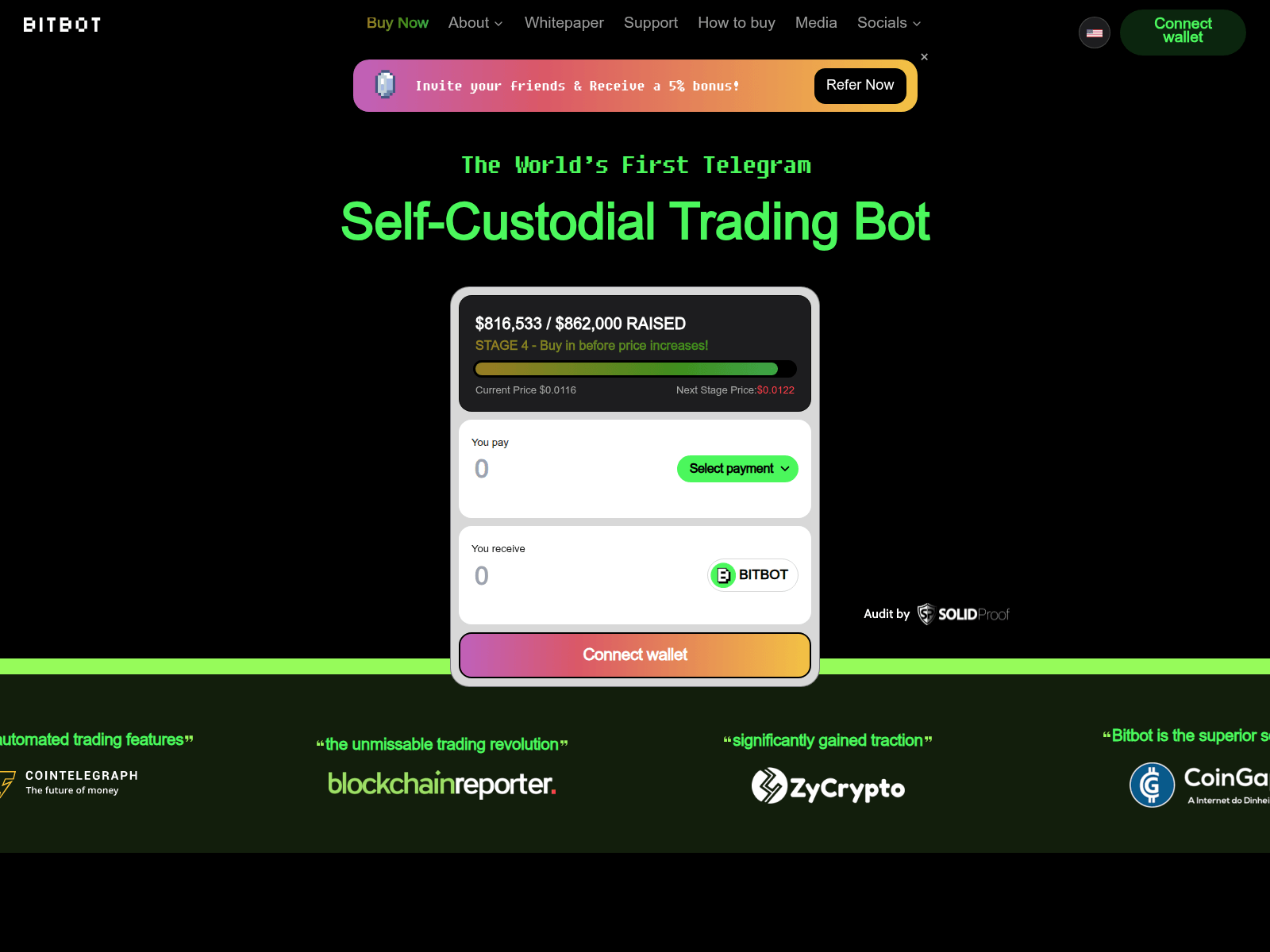 The site displays a page titled “Bitbot - The World’s First Telegram Self-Custodial Trading Bot”.