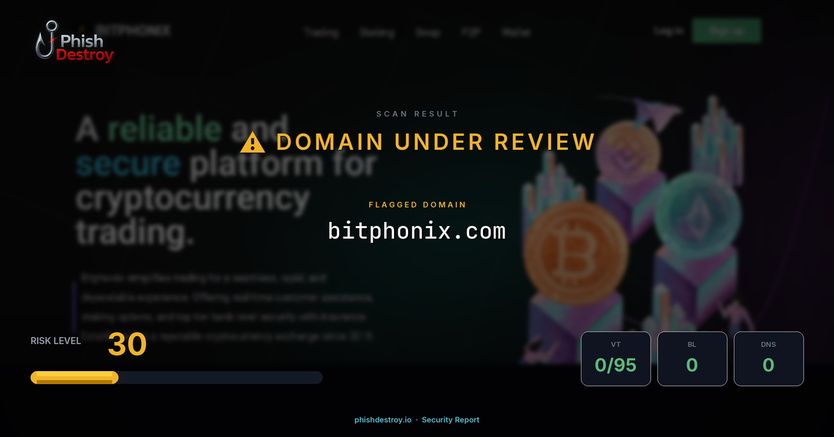 bitphonix.com has been listed on PhishDestroy as a suspicious domain. Scanned by 95 security vendors — automated detections may take time to update. PhishDestroy threat analysts continue to monitor this domain.