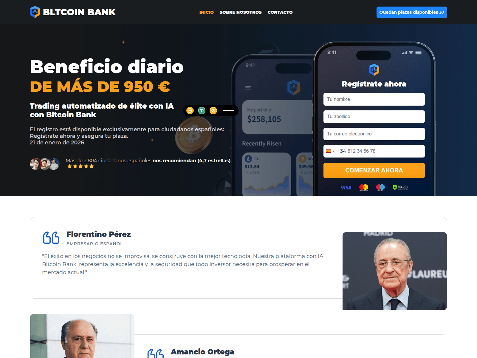 The site displays a page titled “Bltcoin Bank - Plataforma Oficial | Trading IA 2026”.