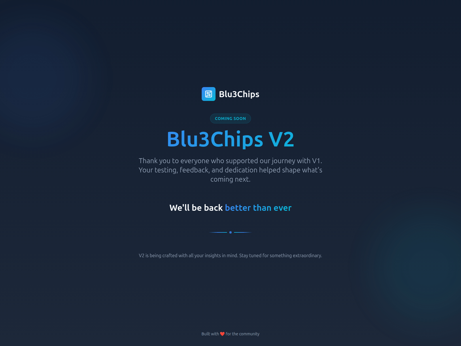 The site displays a page titled “Blu3Chips V2 - Coming Soon”.