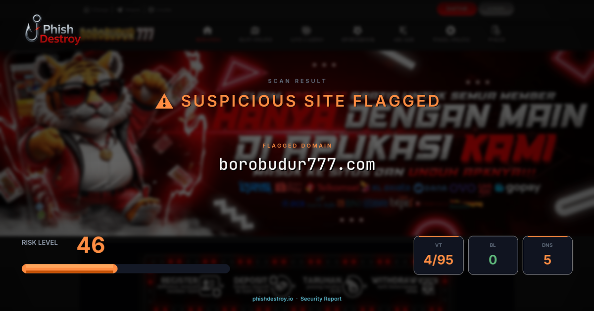 This domain security report for borobudur777.com is maintained by PhishDestroy's automated threat intelligence pipeline. Our system continuously monitors this domain across 4 security vendors on VirusTotal, 1 public blocklists.
