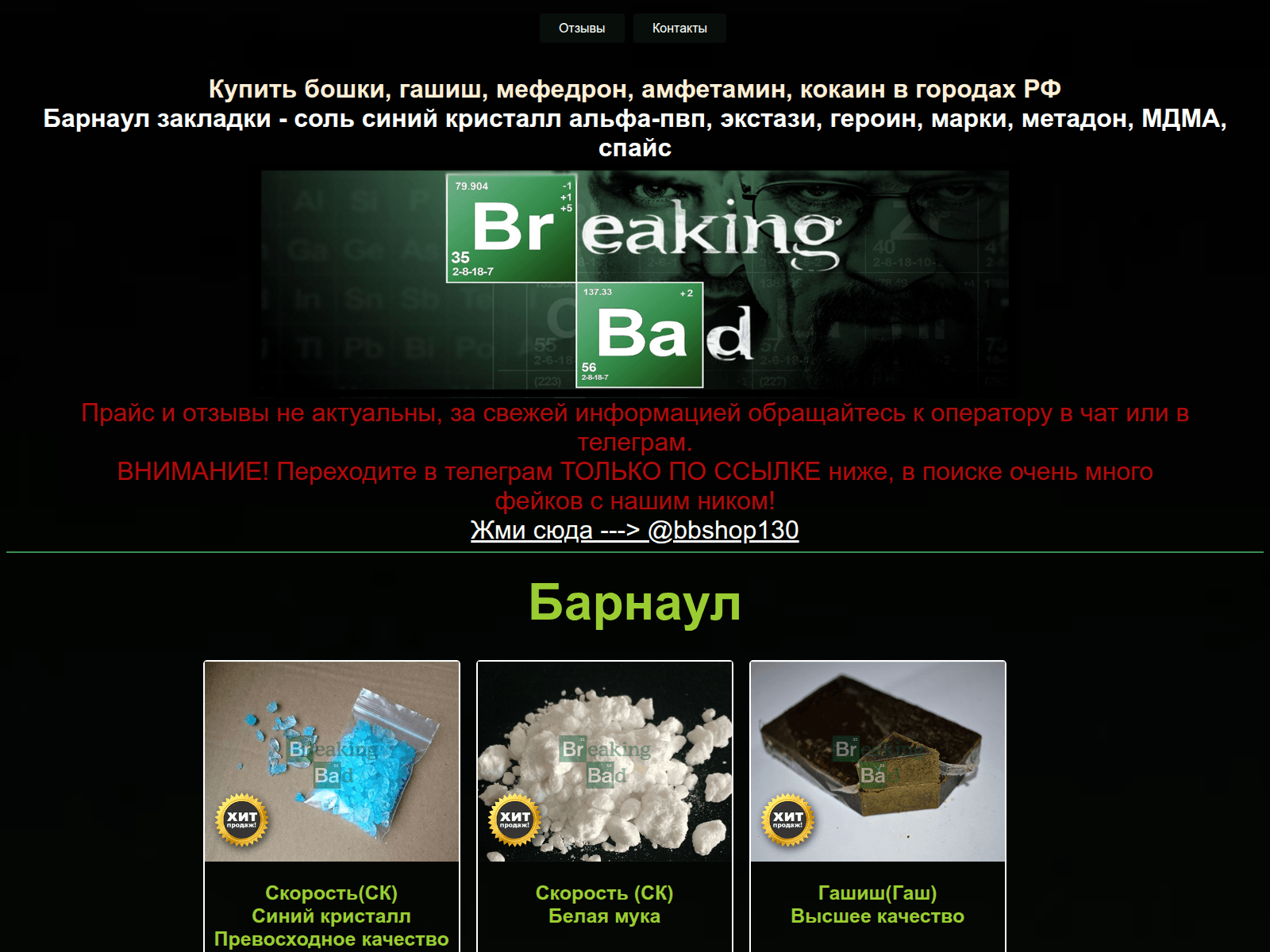 The site displays a page titled “Telegram: @bbshop130 Купить закладку в Барнауле, бошки, гашиш, скорость, амфетамин, фен, мефедрон...”.