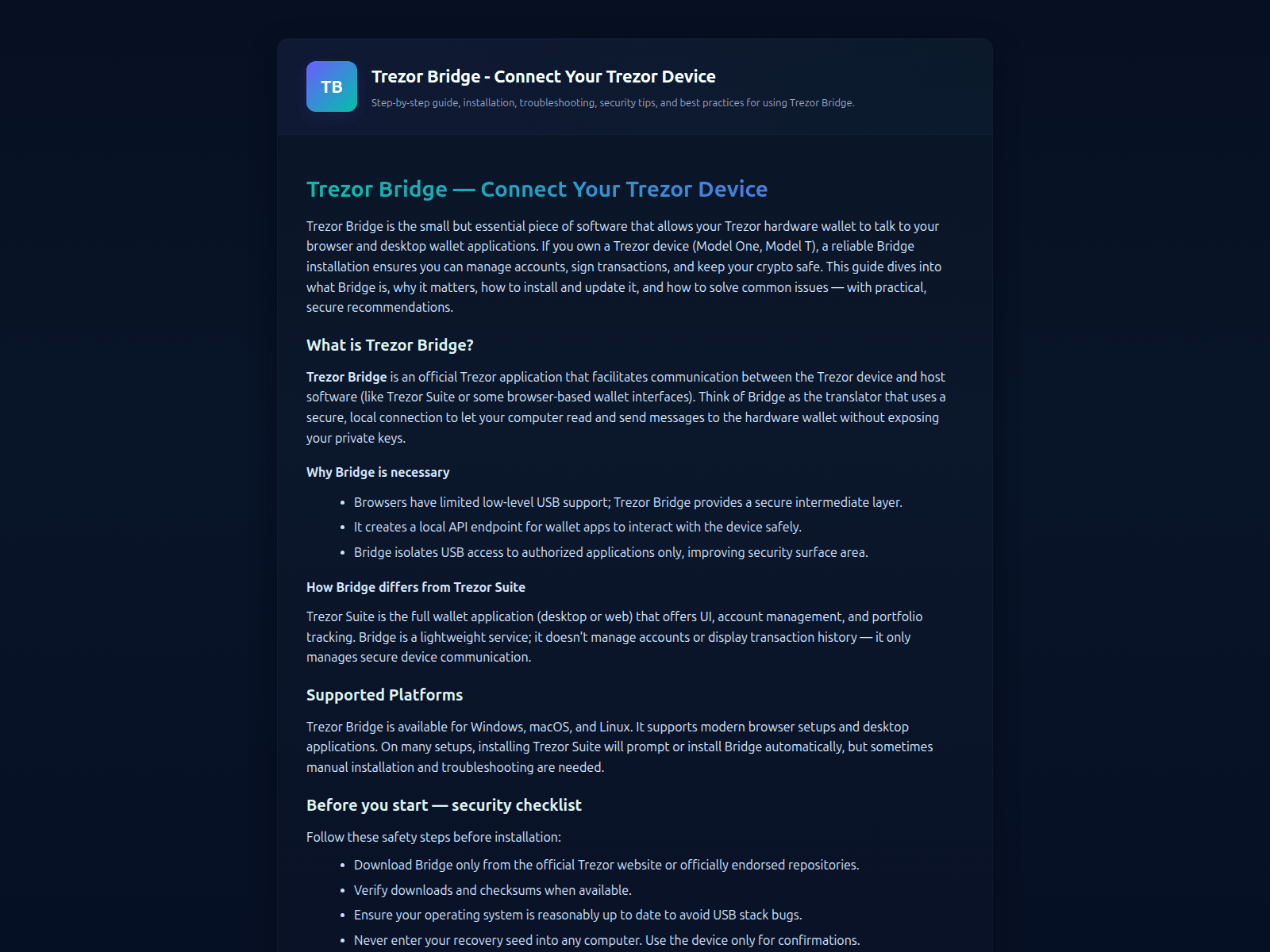 The site displays a page titled “Trezor Bridge - Connect Your Trezor Device”, which may be designed to impersonate Trezor.