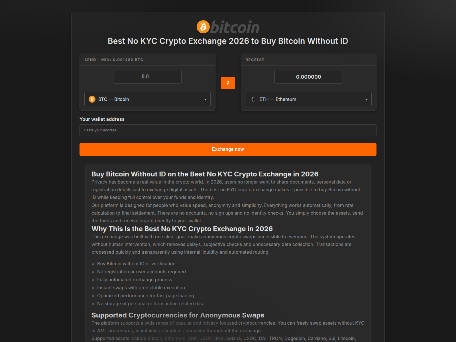 The site displays a page titled “Best No KYC Crypto Exchange 2026 Buy Bitcoin Without ID”, which may be designed to impersonate Bitcoin.