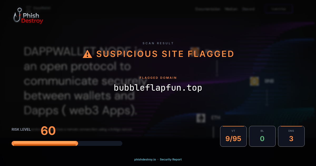 The domain bubbleflapfun[.]top has been identified as a cryptocurrency phishing website. This malicious site targets Web3 users by mimicking legitimate crypto platforms to steal wallet credentials and digital assets.