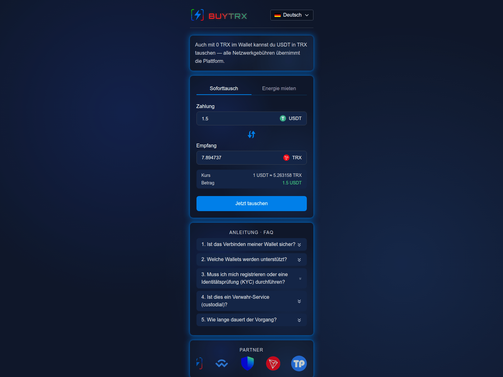 “USDT ⇄ TRX Tausch & TRON Energie mieten | Schnell, sicher, zuverlässig”