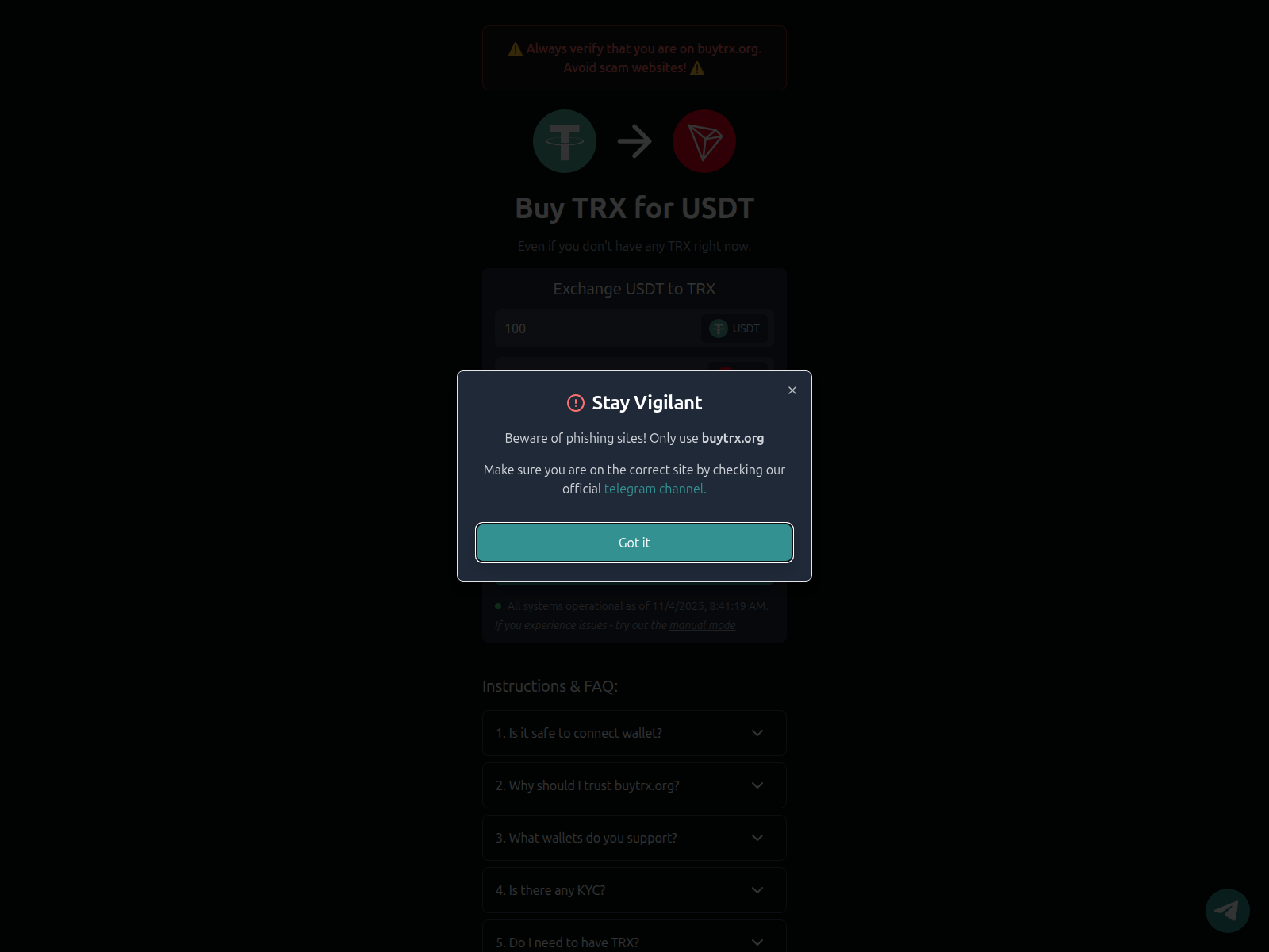 The site displays a page titled “Buy TRX for USDT”, which may be designed to impersonate across.