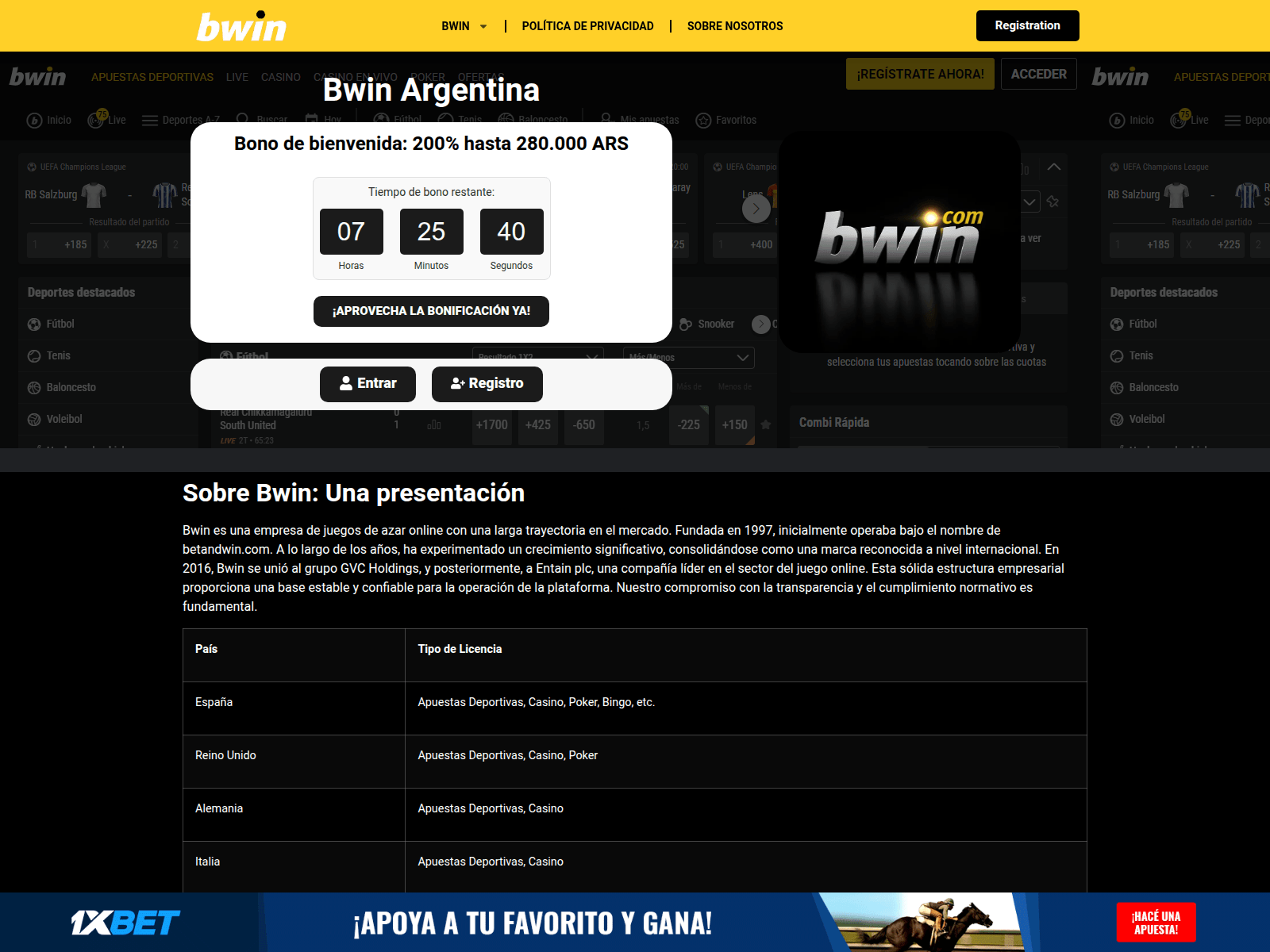 The site displays a page titled “Bwin en Argentina: Bono 500% hasta 695.000 ARS”.