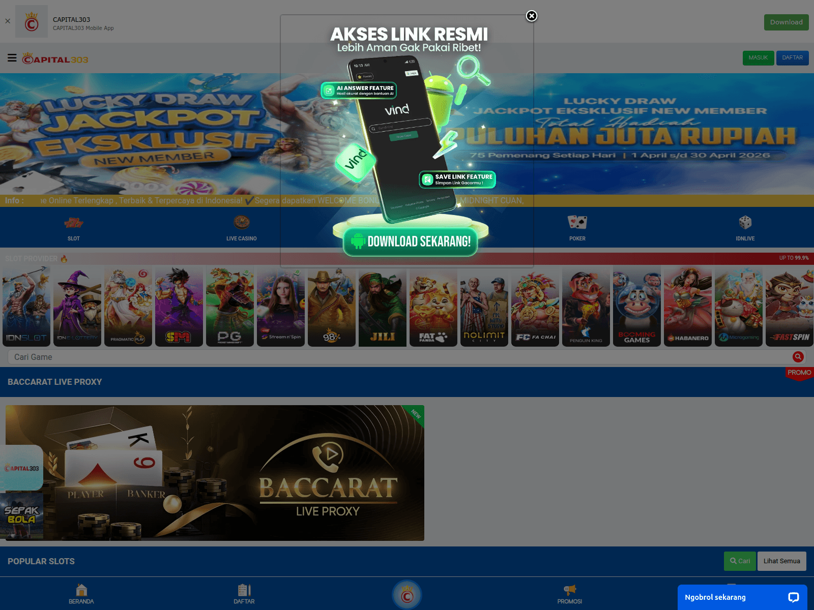The site displays a page titled “CAPITAL303 | Situs Game Online Gampang Menang”.