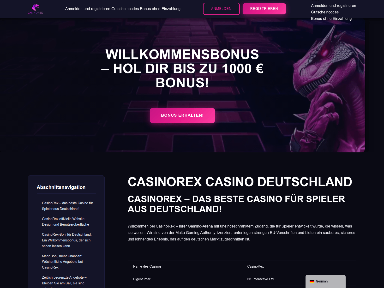 The site displays a page titled “CasinoRex: Offizielle Website [Bonus bis 1000 € + 100 Freispiele]”.