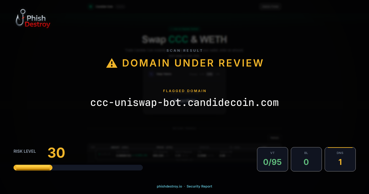 ccc-uniswap-bot.candidecoin.com has been listed on PhishDestroy as a suspicious domain. Scanned by 95 security vendors — automated detections may take time to update. PhishDestroy threat analysts continue to monitor this domain.