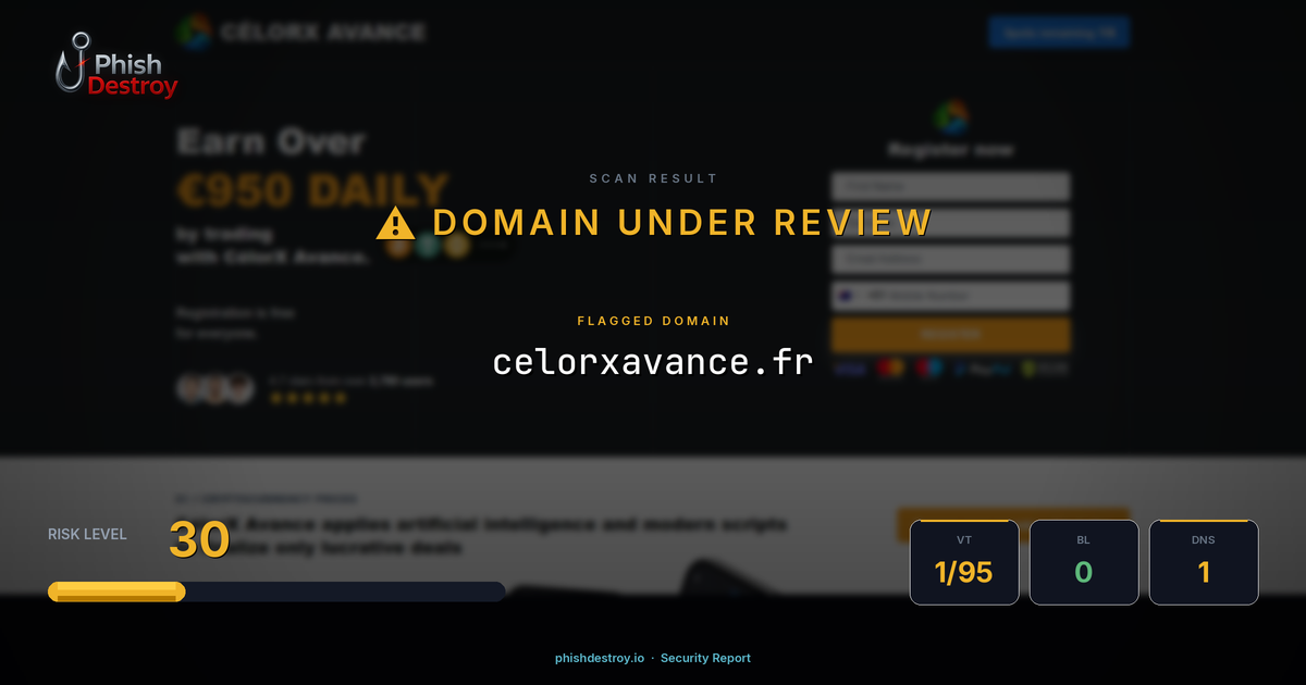 This domain security report for celorxavance.fr is maintained by PhishDestroy's automated threat intelligence pipeline. Our system continuously monitors this domain across 1 security vendors on VirusTotal, 1 public blocklists.