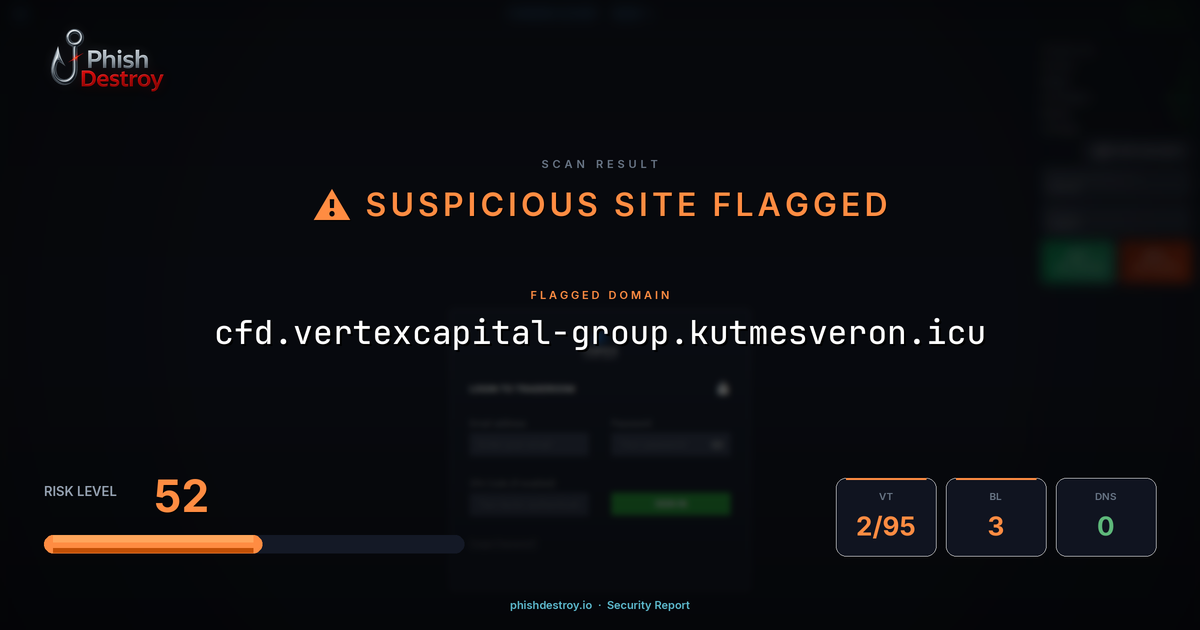 This domain security report for cfd.vertexcapital-group.kutmesveron.icu is maintained by PhishDestroy's automated threat intelligence pipeline. Our system continuously monitors this domain across 2 security vendors on VirusTotal, 3 public blocklists.