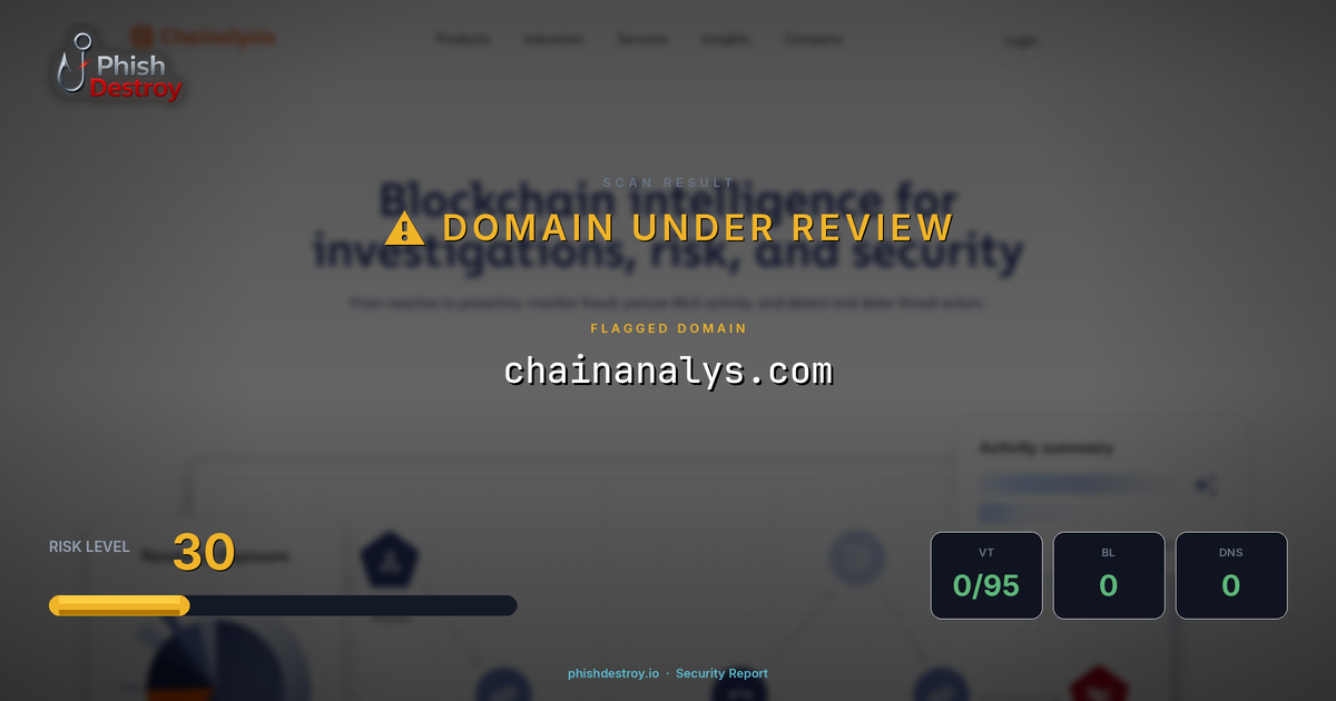 chainanalys.com has been listed on PhishDestroy as a suspicious domain. Scanned by 95 security vendors — automated detections may take time to update. PhishDestroy threat analysts continue to monitor this domain.