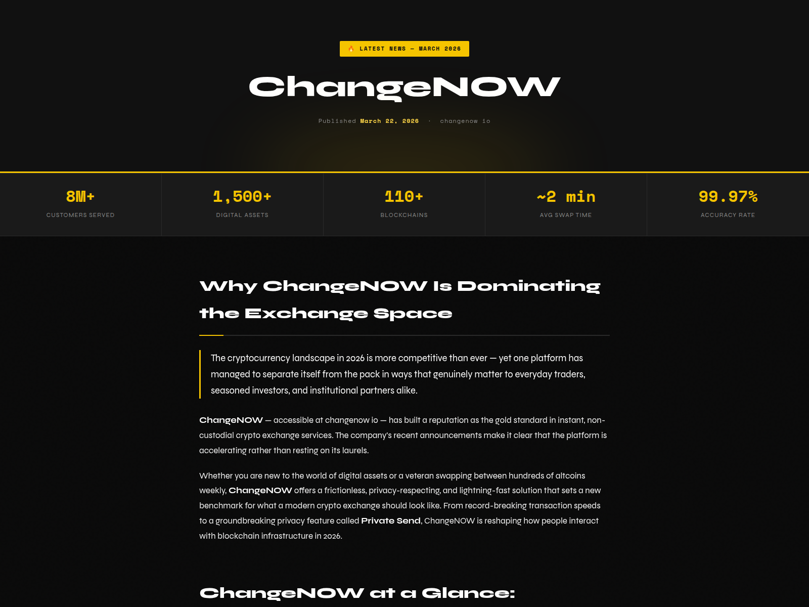 The site displays a page titled “ChangeNOW — The Fastest Crypto Exchange”.