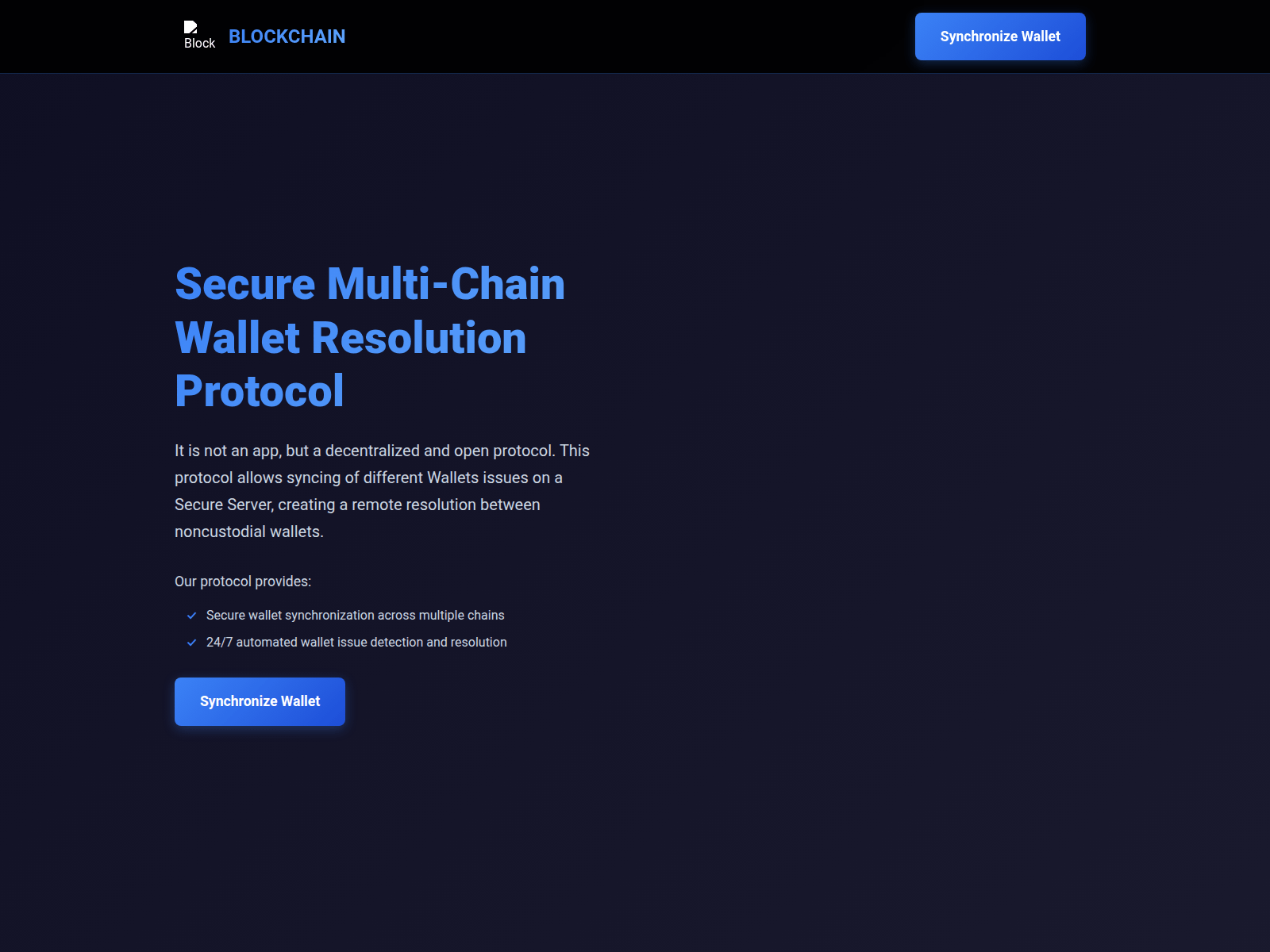 The site displays a page titled “BLOCKCHAIN - Secure Multi-Chain Wallet Resolution Protocol”.