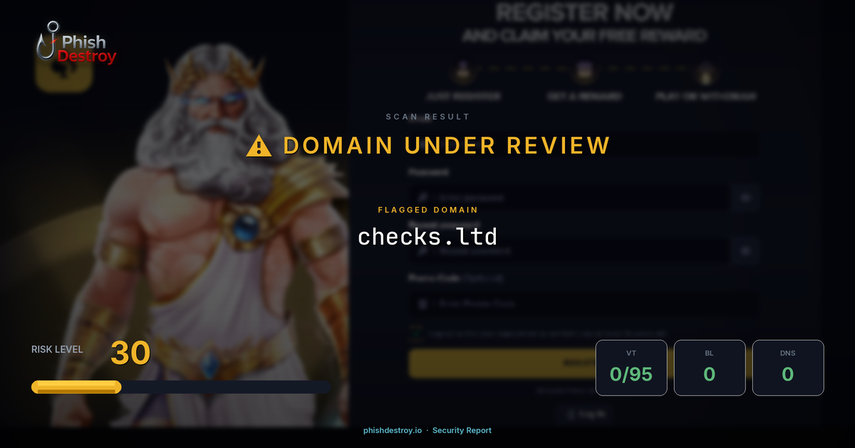 checks.ltd has been listed on PhishDestroy as a suspicious domain. Scanned by 95 security vendors — automated detections may take time to update. PhishDestroy threat analysts continue to monitor this domain.