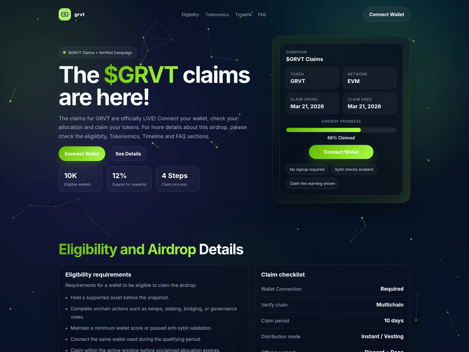 The site displays a page titled “$GRVT Airdrop”, which may be designed to impersonate Airdrop Scam.