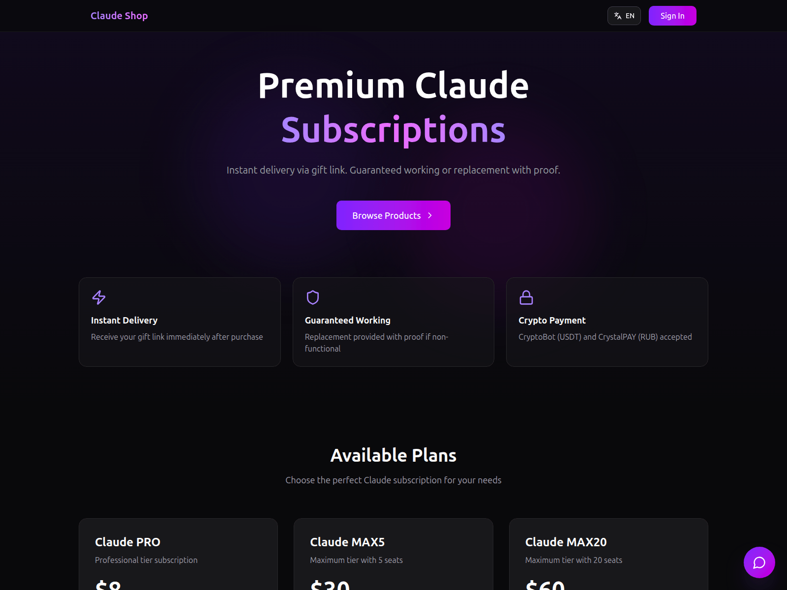 The site displays a page titled “Claude Shop — Premium Subscriptions”.