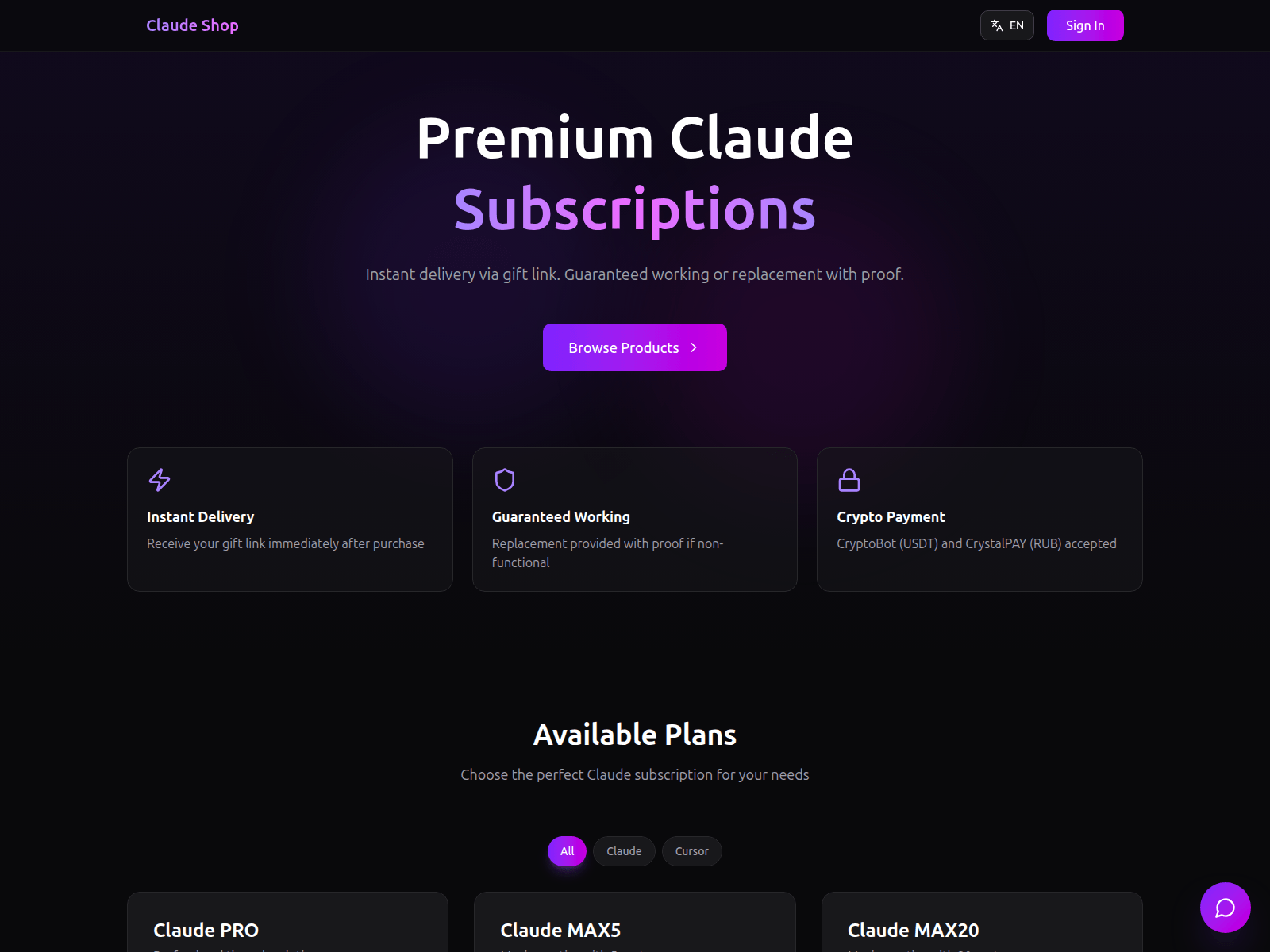 The site displays a page titled “Claude Shop — Premium Subscriptions”.