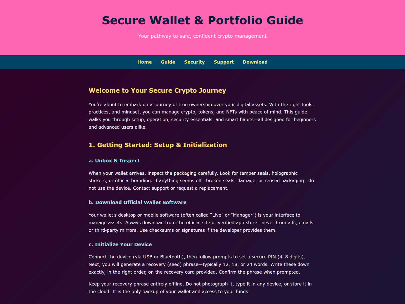 The site displays a page titled “Secure Wallet Onboarding & Portfolio Guide”.