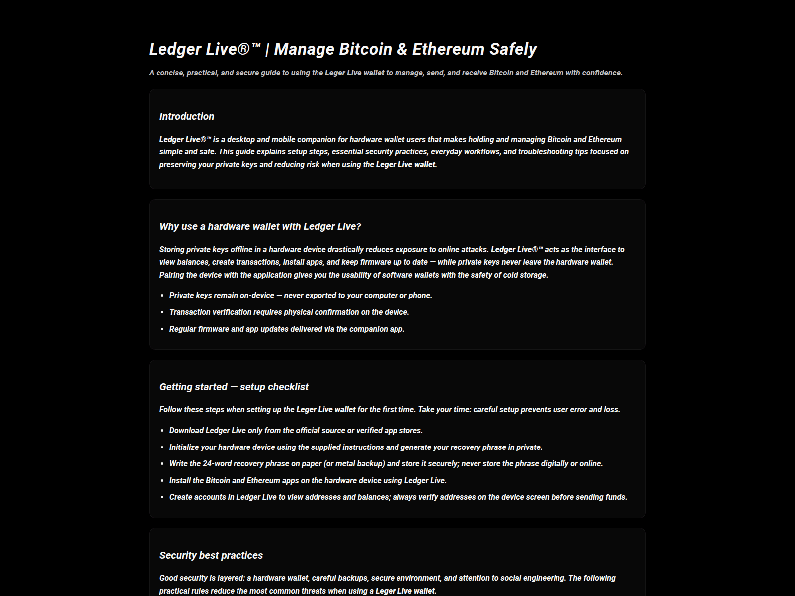- Use a hardware wallet (Ledger, Trezor). Never store large amounts in browser wallets