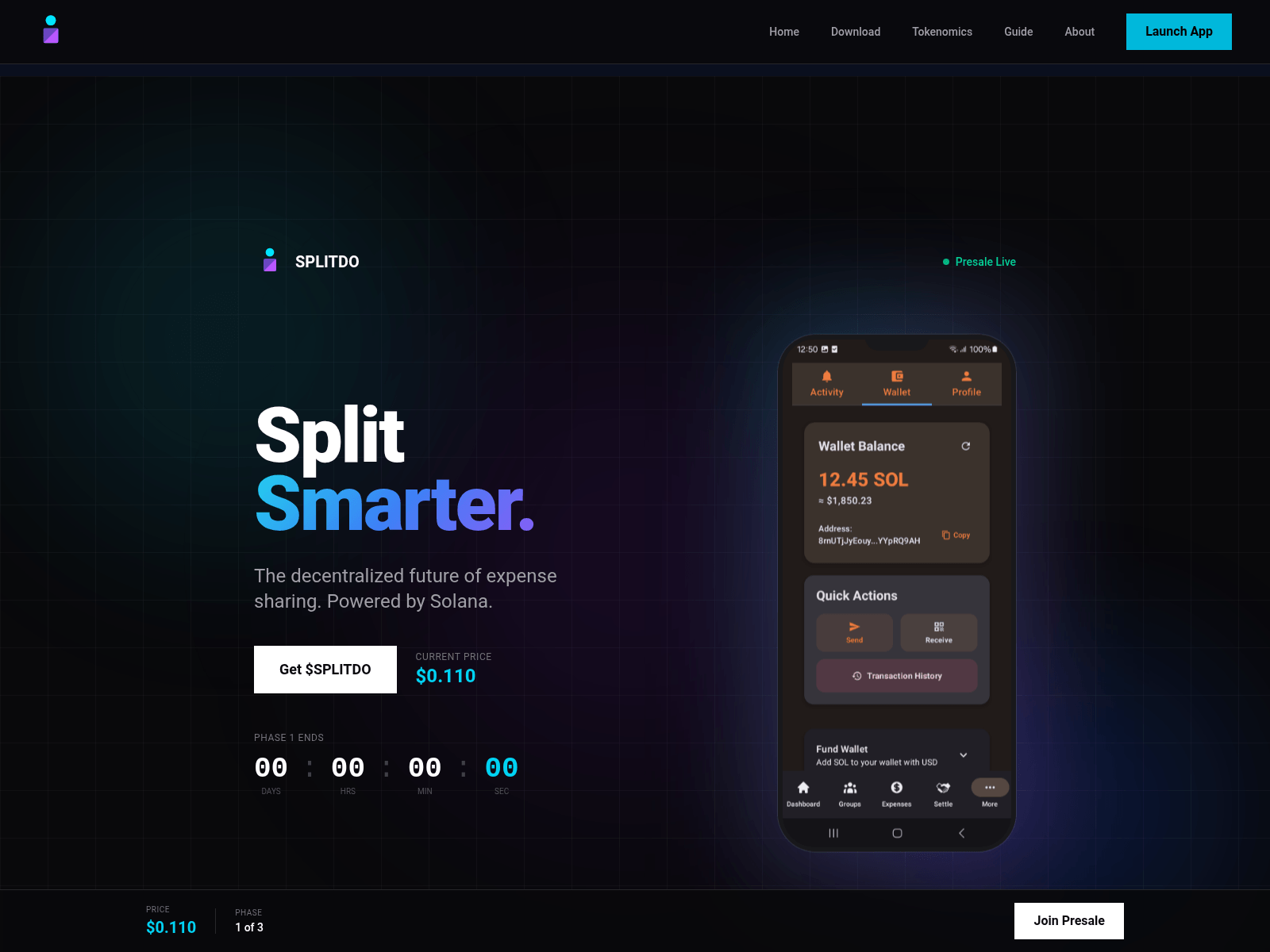 The site displays a page titled “SPLITDO Token Presale | Blockchain Bill Splitting on Solana”, which may be designed to impersonate Solana.